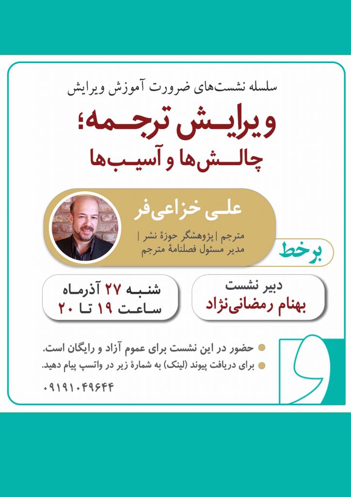 کارگاه مبانی نظری ترجمه ـــ برخط مدرس: علی خزاعیفر ۵ جلسه | شروع کارگاه: ۱۱ دی ۱۴۰۰ شنبهها و دوشنبهها | ساعت ۱۸ تا ۱۹:۳۰ پیشنیاز: آشنایی با زبان انگلیسی و ترجمه