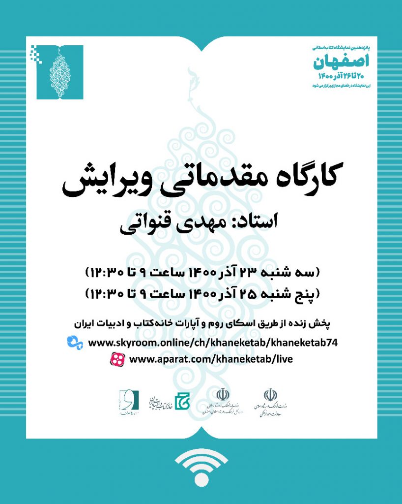 کارگاه مقدماتی ویرایش خانه کتاب و ادبیات ایران با همکاری اداره کل فرهنگ و ارشاد اسلامی استان اصفهان، به مناسبت نمایشگاه کتاب استان اصفهان ۳ کارگاه آموزشی طراحی کرده است؛ که متقاضیان میتوانند در اسکای روم به صورت رایگان ملاحظه و شرکت کنند. کارگاه مقدماتی ویرایش استاد: مهدی قنواتی (سه شنبه ۲۳ آذر ۱۴۰۰ ساعت […]