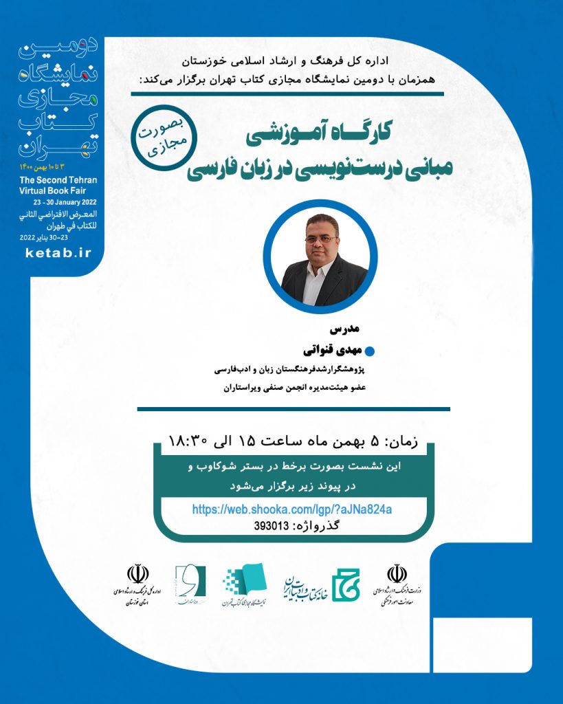 کارگاه آموزشی مبانی درستنویسی در زبان فارسی مدرس: مهدی قنواتی زمان: ۵ بهمن ماه ۱۴۰۰ | ساعت ۱۵ تا ۱۸:۳۰ این نشست به صورت برخط در بستر شوکاوب و در پیوند زیر برگزار میشود.