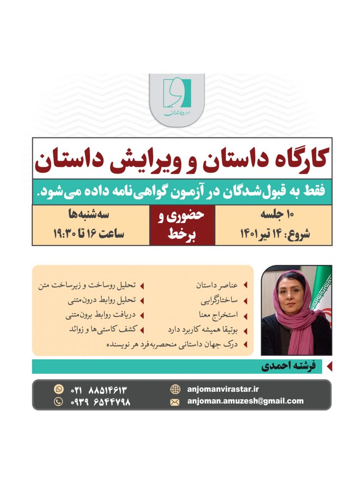 کارگاه داستان و ویرایش داستان * حضوری و برخط * مدرس: فرشته احمدی ۱۰ جلسه || شروع: ۱۴ تیر ۱۴۰۱ سهشنبهها || ساعت ۱۶ تا ۱۹:۳۰ عناصر داستان ساختارگرایی درک جهان داستانی منحصربهفرد هر نویسنده استخراج معنا بوتیقا همیشه کاربرد دارد تحلیل متن آنالیز متن تحلیل روابط درونمتنی دریافت روابط برونمتنی کشف کاستیها و زوائد […]