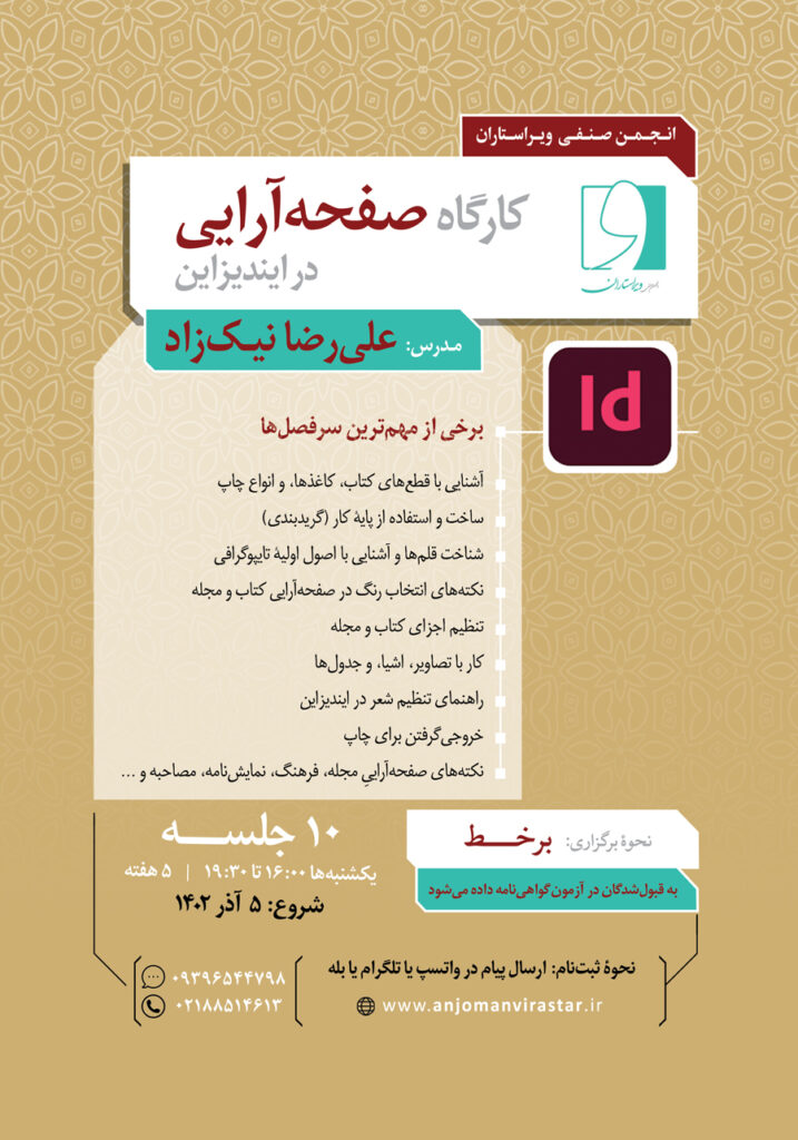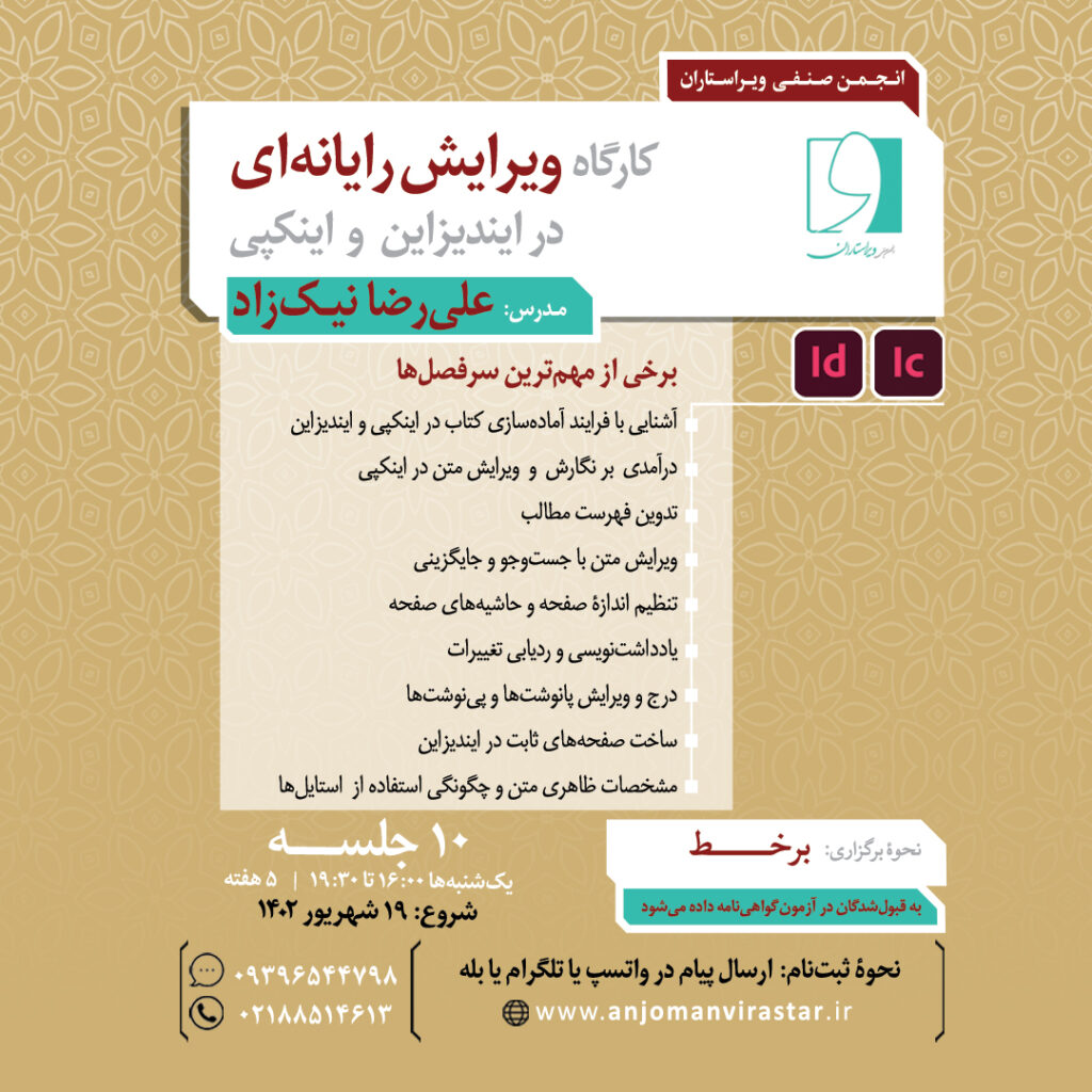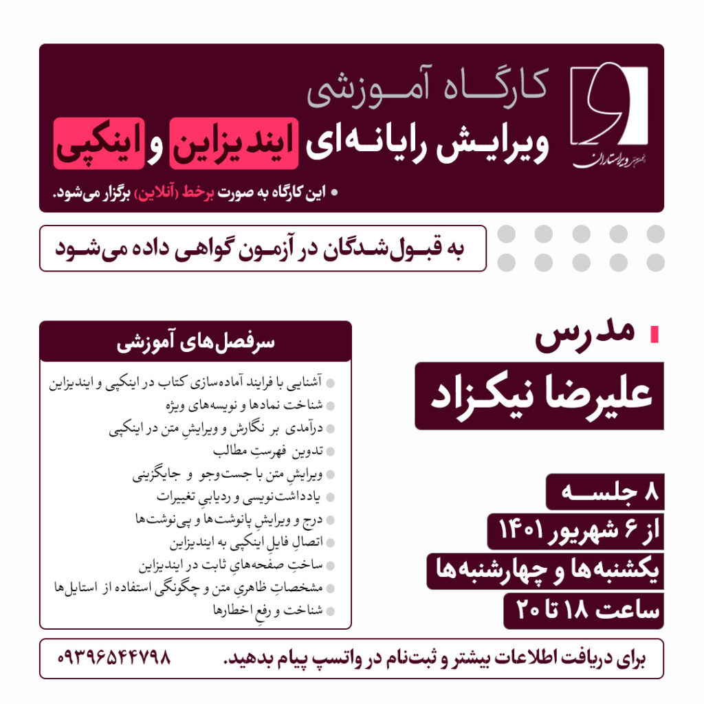کارگاه آموزشی ویرایش رایانهای ایندیزاین و اینکپی ــ برخط به قبولشدگان در آزمون گواهی داده میشود مدرس: علیرضا نیکزاد ۸ جلسه | از ۶ شهریور ۱۴۰۱ یکشنبهها و چهارشنبهها | ساعت ۱۸ تا ۲۰