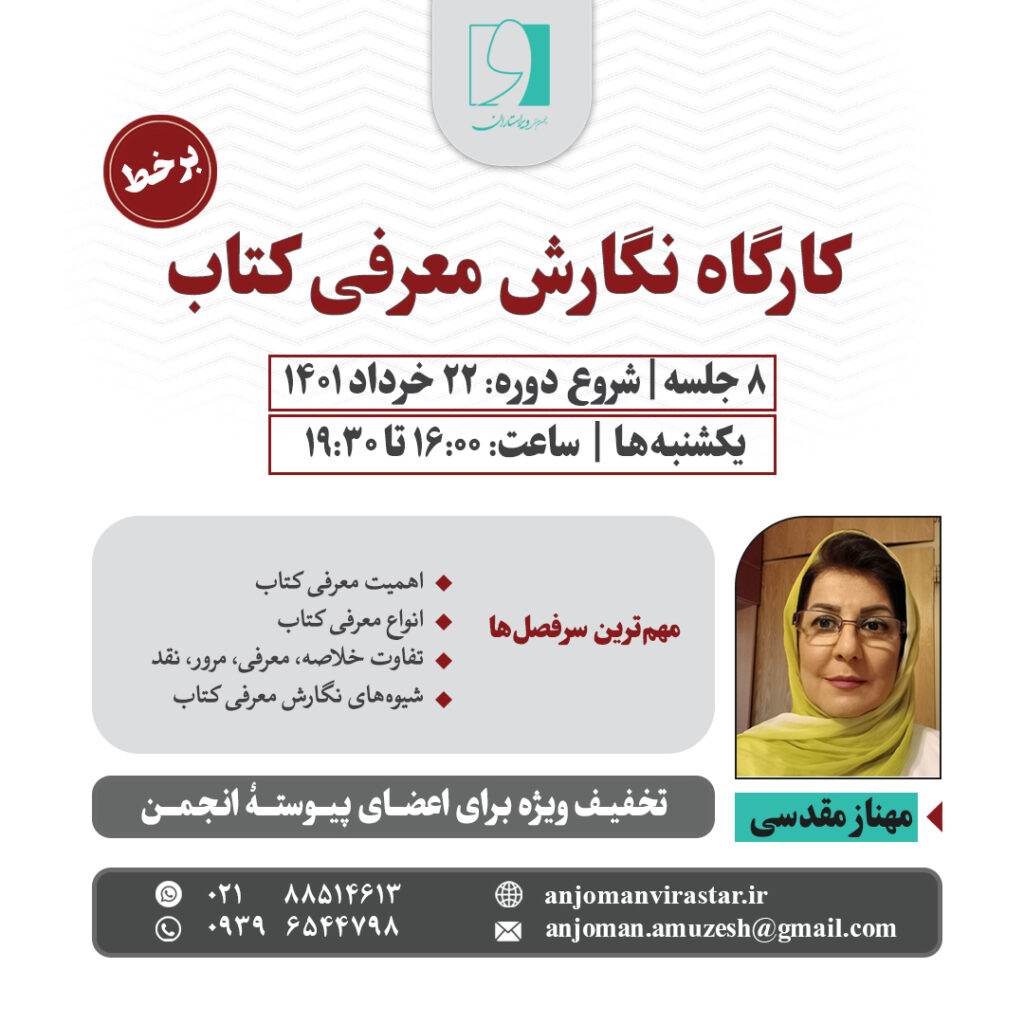 کارگاه نگارش معرفی کتاب ـ برخط تخفیف ویژه برای اعضای پیوستۀ انجمن ۸ جلسه | شروع دوره: ۲۲ خرداد ۱۴۰۱ یکشنبهها | ساعت ۱۶ تا ۱۹:۳۰