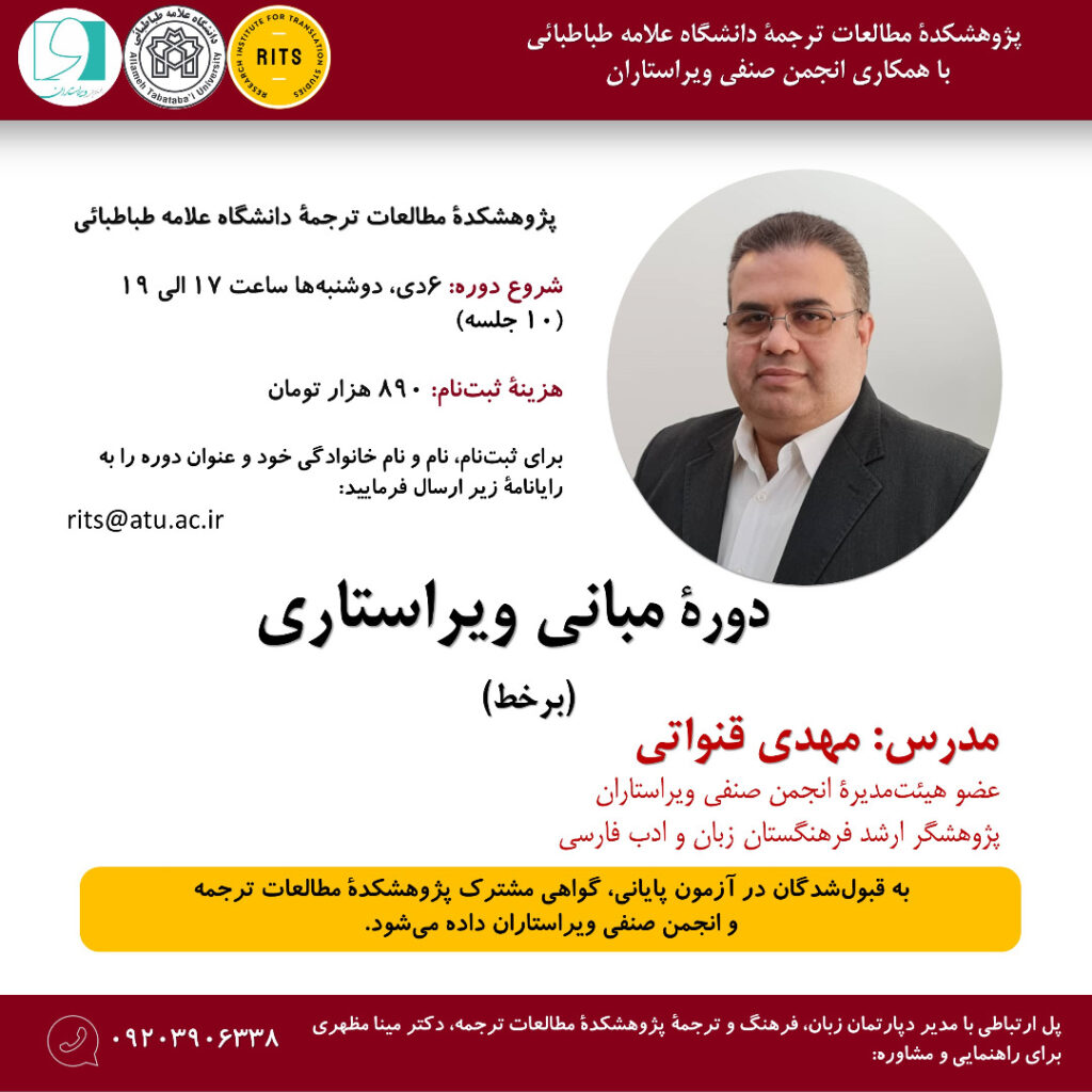 دورۀ مبانی ویراستاری __ برخط مدرس: مهدی قنواتی شروع دوره: ۶ دی ۱۴۰۰ | ساعت ۱۷ تا ۱۹ ۱۰ جلسه | هزینه ثبتنام ۸۹۰ هزارتومان به قبولشدگان در آزمون پایانی گواهی مشترک پژوهشکده مطالعات ترجمه و انجمن صنفی ویراستاران داده میشود.