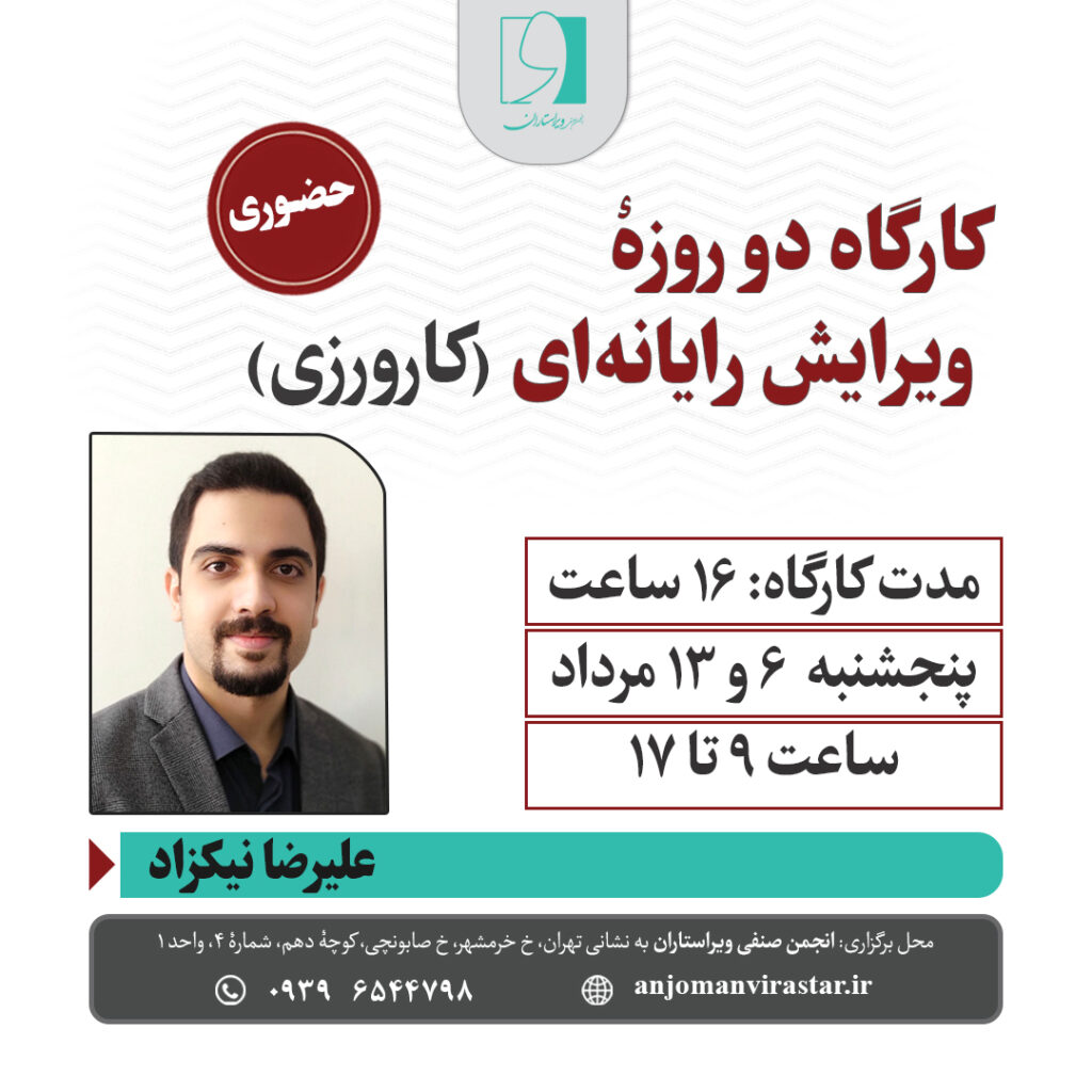 کارگاه دو رروزۀ ویرایش رایانهای (کارورزی) ــ حضوری مدرس: علیرضا نیکزاد مدت کارگاه: ۱۶ ساعت پنجشنبه ۶ و ۱۳ مرداد ساعت ۹ تا ۱۷