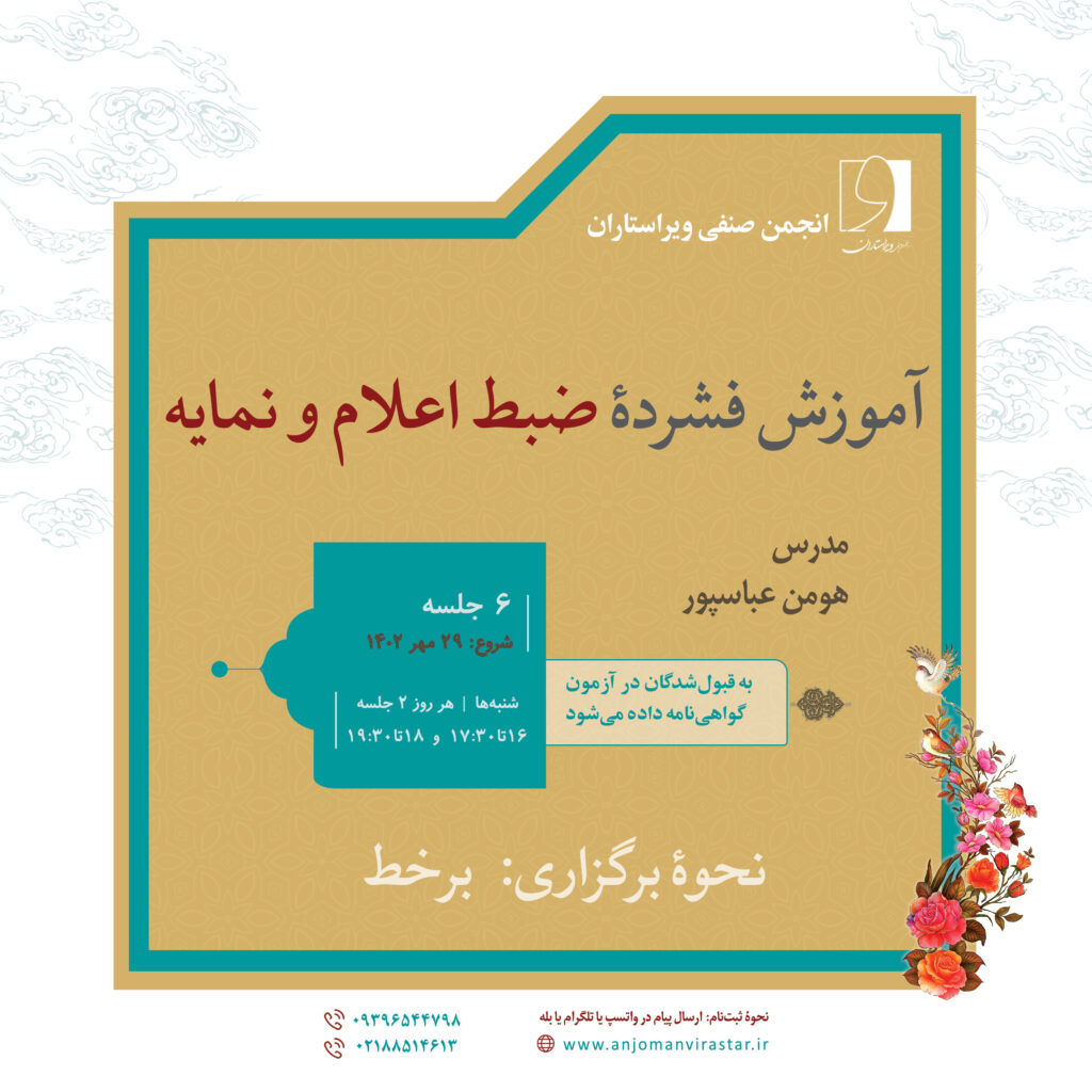 ثبتنام تکدرس ششمین دورهٔ جامع آموزش فشردهٔ ضبط اعلام و نمایه مدرس: هومن عباسپور شنبهها، ساعت ۱۶ تا ۱۹:۳۰ ۶ جلسه (۳ هفته) نحوهٔ برگزاری: برخط برای ثبتنام به شمارهٔ آموزش در واتسپ، تلگرام یا بله پیام بدهید. ۰۹۳۹۶۵۴۴۷۹۸