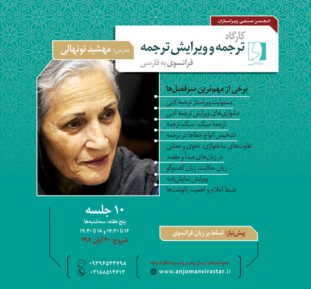 کارگاه ترجمه و ویرایش ترجمه (فرانسوی به فارسی)، از ۲۳ آبان ۱۴۰۲ و با تدریس سرکار خانم مهشید نونهالی، در ۱۰ جلسه و در طول پنج هفته، سهشنبهها ساعت ۱۶ تا ۱۹:۳۰ و بهصورت مجازی (در بستر وبینارپلاس) برگزار میشود. این کارگاه برای ویراستاران و مترجمان مناسب است و کسانی که قصد ثبتنام دارند باید […]