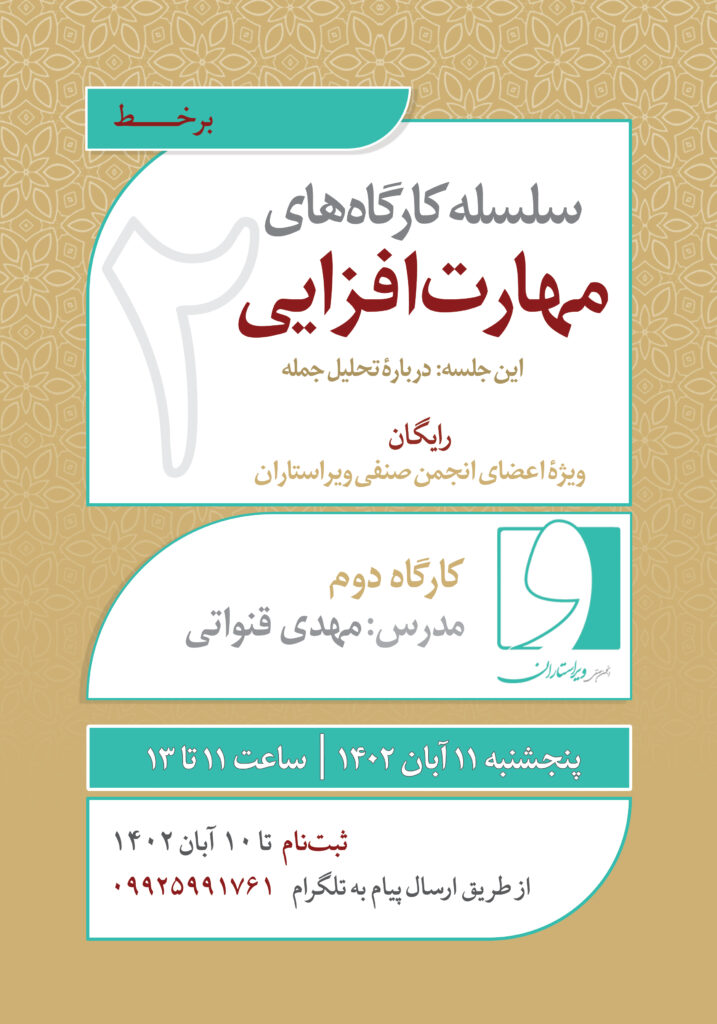 سلسله کارگاههای مهارتافزایی رایگان، ویژۀ اعضای انجمن صنفی ویراستاران کارگاه دوم: پنجشنبه ۱۱ آبان ۱۴۰۲، ساعت ۱۱ تا ۱۳ مدرس: مهدی قنواتی برخط، در بستر وبینارپلاس برای ثبتنام در این کارگاه، نام و نام خانوادگی و شمارۀ همراه خود را به شمارۀ روابط عمومی (۰۹۹۲۵۹۹۱۷۶۱) در تلگرام ارسال کنید.