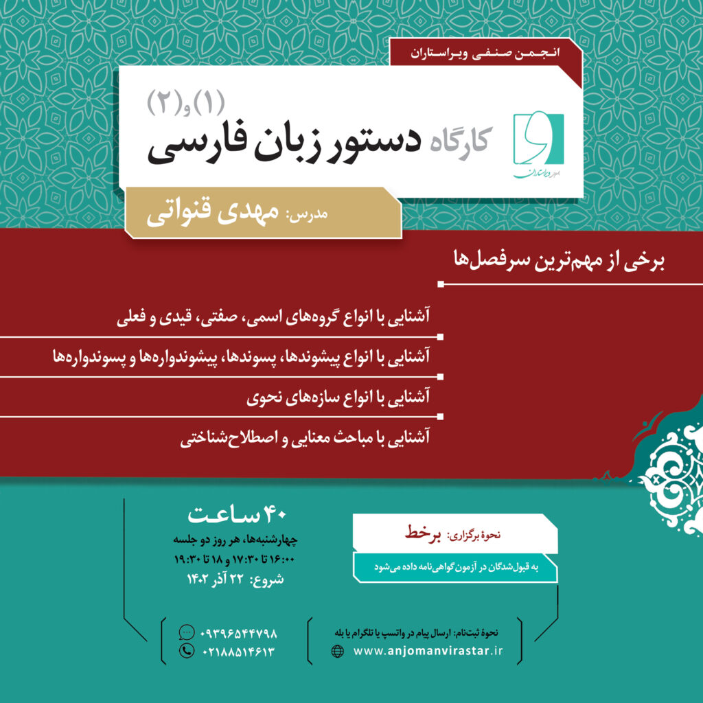 کارگاه دستور زبان فارسی (۱) روزهای ۲۶ مرداد و ۲ و ۹ شهریور ۱۴۰۲ به صورت حضوری و مجازی، و با تدریس مهدی قنواتی برگزار میشود. اطلاعات تکمیلی و پیام صوتی مدرس این کارگاه را در ادامۀ مطلب ملاحظه کنید. برخی از مهمترین سرفصلها آشنایی با انواع واج و تکواژ در زبان فارسی […]