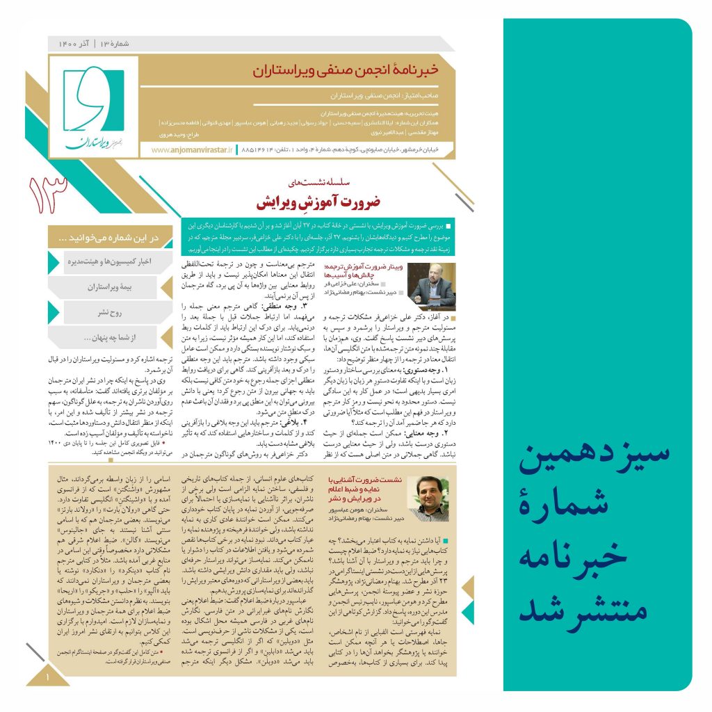 سیزدهمین خبرنامۀ انجمن صنفی ویراستاران