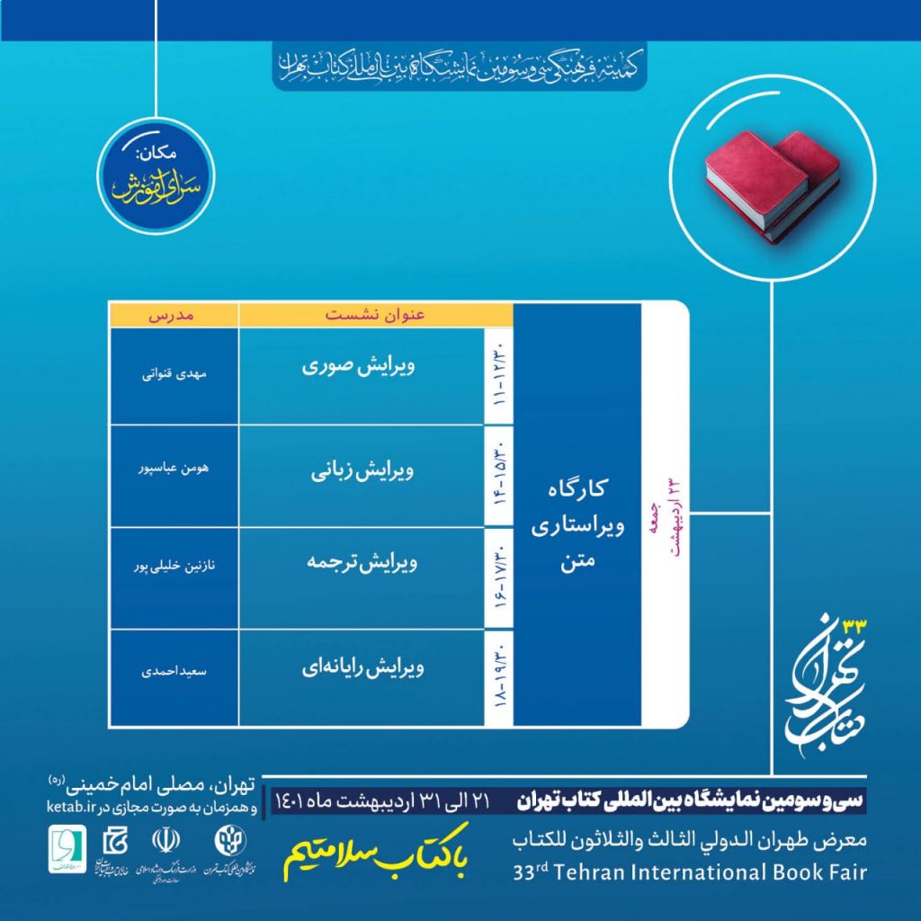 نشست «تایپ مناسب نشر، کمتر از انگشتان یک دست» قلم مناسب برای کتابها کدام است؟ آیا قلمهای رایج برای نشر کافی است؟ چه کسانی در انتخاب قلم برای کتابها تصمیم میگیرند؟ مخاطبان چه سهمی در انتخاب قلم دارند؟ نشست بررسی قلم یا قلمهای مناسب برای نشر و معرفی ویژگیهای قلم برتر از منظر گرافیکی و […]