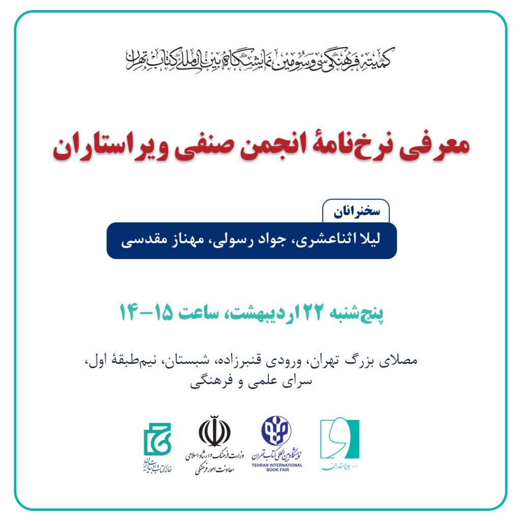معرفی نرخنامۀ ویرایش انجمن صنفی ویراستاران در سیوسومین نمایشگاه بینالمللی کتاب تهران نشست معرفی نرخنامۀ ویرایش انجمن صنفی ویراستاران، پنجشنبه ۲۲ اردیبهشت ۱۴۰1، در سالن سرای اهل قلم در نمایشگاه بینالمللی کتاب تهران با حضور ناشران و ویراستاران و اعضای انجمن برگزار شد. در این نشست آقای دکتر سیدجواد رسولی، عضو هیئتمدیرۀ انجمن، خانم دکتر […]
