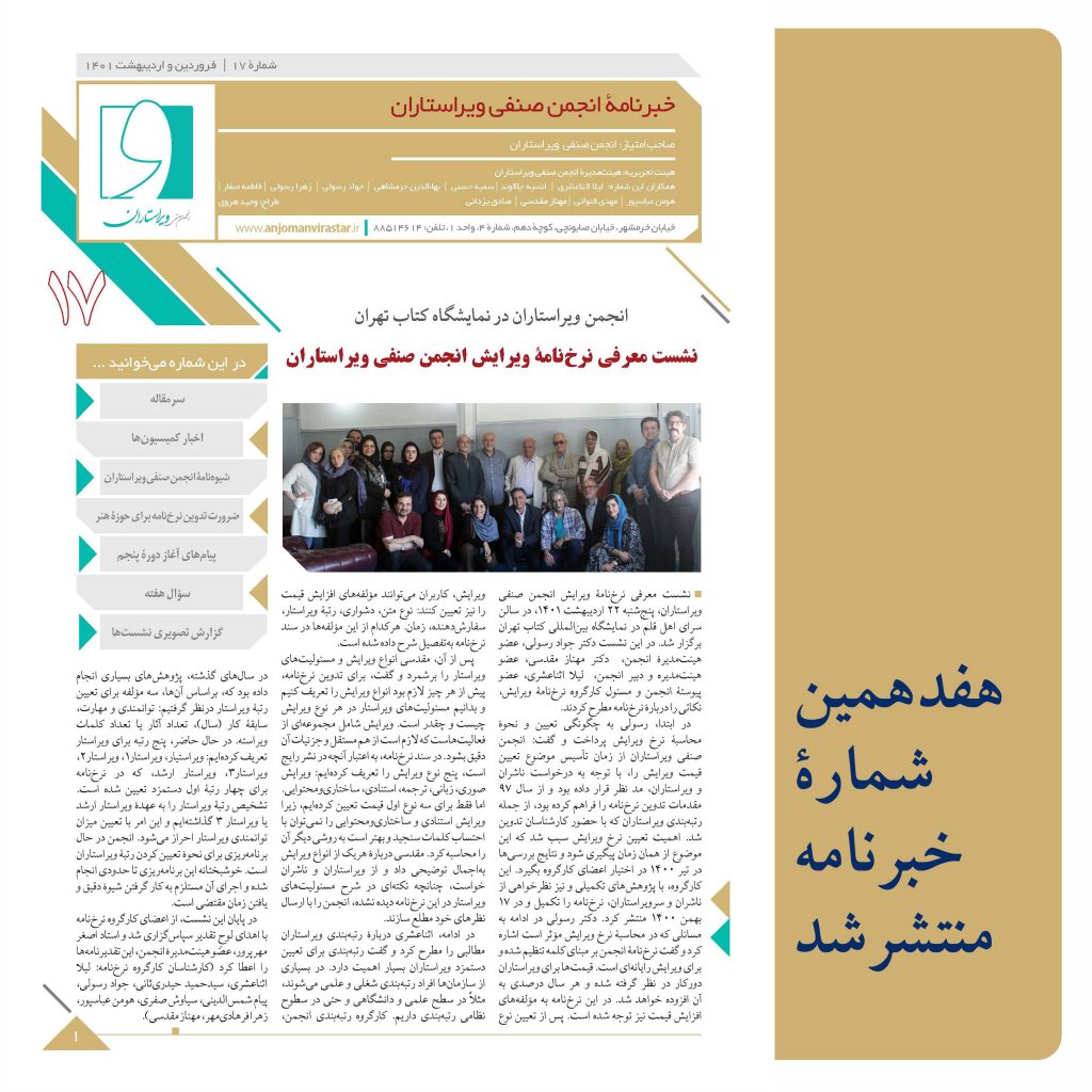 هفدهمین خبرنامۀ انجمن صنفی ویراستاران