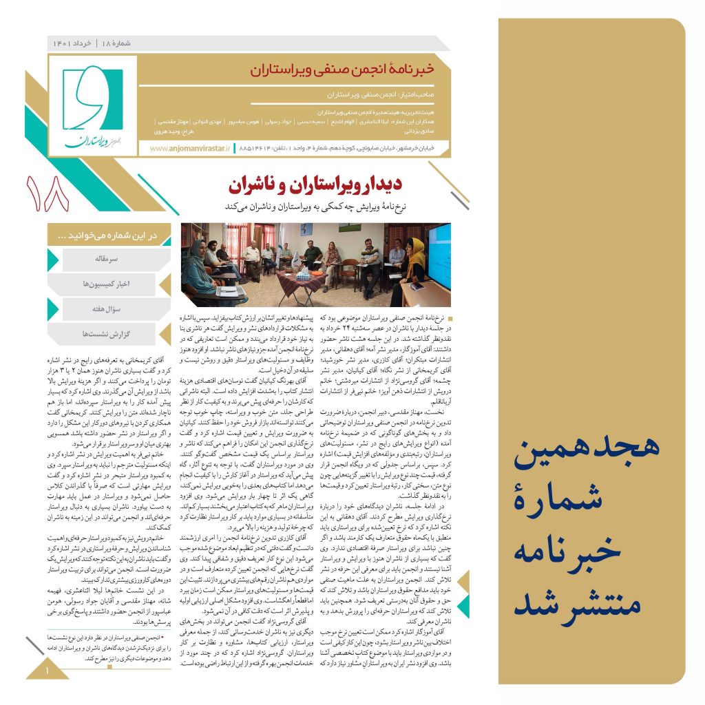 هجدهمین خبرنامۀ انجمن صنفی ویراستاران