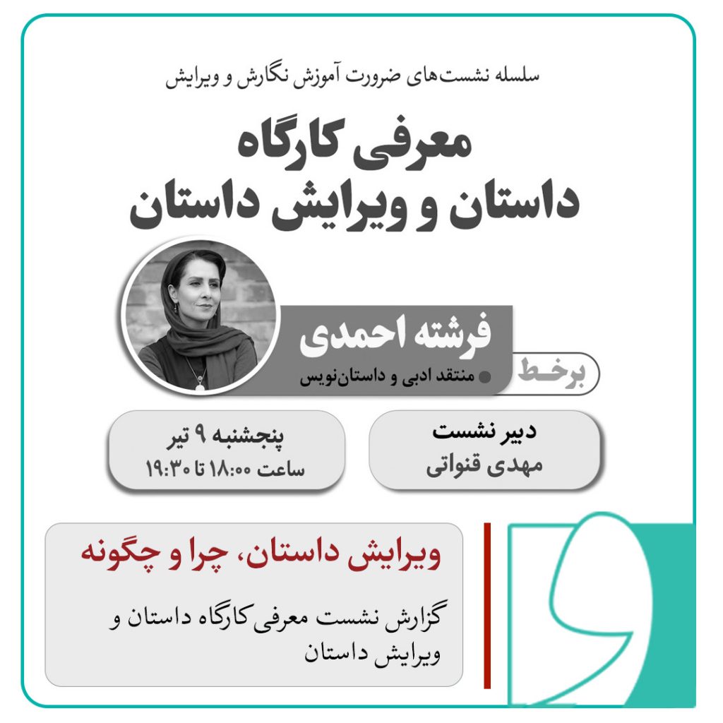 | ویرایش داستان، چرا و چگونه | نشست مجازی معرفی «کارگاه داستان و ویرایش داستان» در ۹ تیر ۱۴۰۱ در وبینارپلاس برگزار شد. در این نشست، مهدی قنواتی، رئیس کمیسیون آموزش انجمن، با فرشته احمدی، پژوهشگر، ویراستار و مدرس این کارگاه، به گفتوگو نشست. نخست، مهدی قنواتی به مشکلاتی که شیوع ویروس کرونا در چند […]