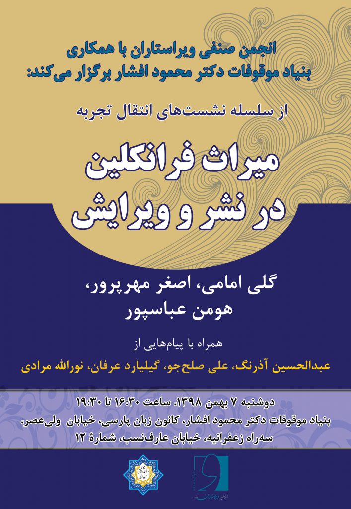 در نشستی که روز دوشنبه ۷ بهمن ۱۳۹۸ در بنیاد موقوفات دکتر محمود افشار، کانون زبان پارسی برگزار شد، گفتههای نُه تن از همکاران مؤسسۀ فرانکلین مطرح شد. در ابتدای نشست از اعضای هیئتمدیرۀ پیشین، بهویژه ریاست هیئتمدیرۀ قبلی، استاد فریبرز مجیدی، با اهدای لوحِ تقدیر قدردانی شد. نخستین سخنران این نشست، گلی امامی، رئیس […]